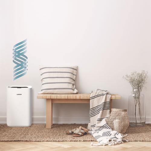 O desumidificador Eeese Hugo 13L distingue-se de outros desumidificadores do mesmo tamanho pelo seu nível de ruído extremamente baixo de apenas 35 dB(A). Este desumidificador Eeese Hugo 13L é excelente para todas as divisões da casa até 65 m². O Hugo também é adequado para utilização em casas de banho, uma vez que tem a classificação IPX4 para utilização em áreas húmidas. Além disso, tem um consumo de energia muito baixo, de apenas 145 watts. DESUMIDIFICADOR IPX4